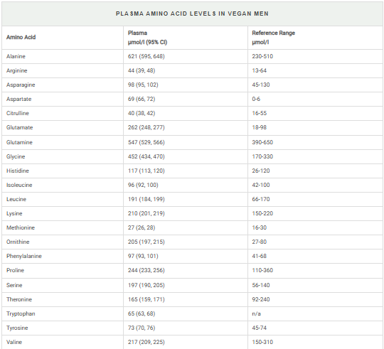 नीचे दी गई तालिका एपिक-ऑक्सफ़ोर्ड में वीगन पुरुषों के अमीनो एसिड के प्लाज्मा स्तर की तुलना अमेरिकी राष्ट्रीय चिकित्सा पुस्तकालय (एनएलएम) द्वारा दी गई संदर्भ श्रेणियों से करती है। एनएलएम बताता है कि ये संख्याएँ प्रयुक्त विशिष्ट प्रयोगशाला विधियों पर निर्भर करती हैं (एनएलएम, 2016)।