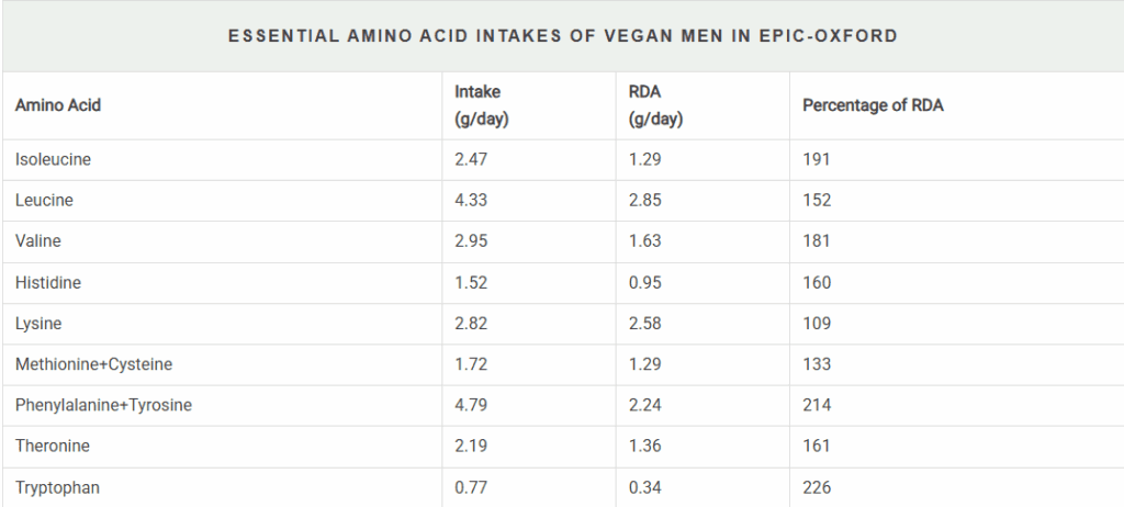 नीचे दी गई तालिका EPIC-ऑक्सफोर्ड में वीगन अमीनो एसिड सेवन की तुलना संयुक्त राज्य अमेरिका के RDA अमीनो एसिड से करती है।
