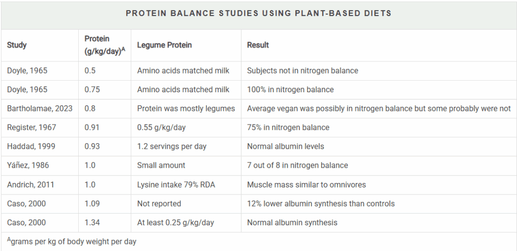कैसो एट अल. (2000) ने पाया कि 26% पौध आधारित प्रोटीन की तुलना में 10 दिनों तक 63% पादप प्रोटीन वाला आहार लेने वाले पुरुषों में एल्ब्यूमिन संश्लेषण की दर 12% कम थी; कुल प्रोटीन 78 ग्राम/दिन था। 18 ग्राम/दिन सोया प्रोटीन शामिल करने के बाद एल्ब्यूमिन संश्लेषण सामान्य हो गया, जिससे पादप प्रोटीन 78% और कुल प्रोटीन 96 ग्राम/दिन हो गया। प्रतिभागी सोया के बिना लगभग 1.09 ग्राम/किग्रा/दिन और सोया के साथ 1.34 ग्राम/किग्रा/दिन खा रहे थे। 63% पौध आधारित प्रोटीन वाले आहार में दो अन्य प्रोटीन, प्रीएल्ब्यूमिन और ट्रांसफ़रिन, का संश्लेषण भी कम था। ट्रांसफ़रिन, एक लौह परिवहन प्रोटीन, का कम संश्लेषण दिलचस्प है क्योंकि लाइसिन की खुराक लौह अवशोषण को बढ़ाती पाई गई है।
