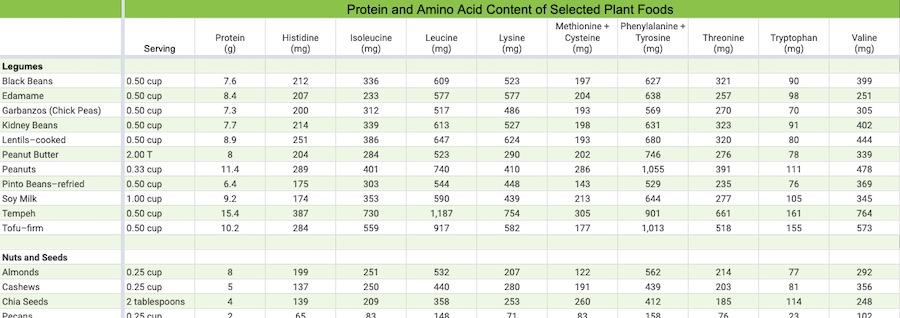 हमारी ऑनलाइन स्प्रेडशीट, चयनित पादप खाद्य पदार्थों में प्रोटीन और अमीनो अम्ल की मात्रा देखें।